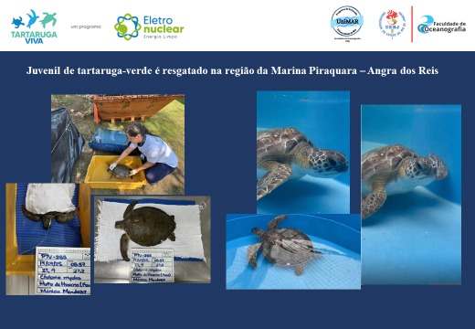 Mais um indivíduo juvenil de tartaruga-verde (Chelonia mydas) é resgatado pelo Programa Tartaruga Viva. O indivíduo foi encontrado na região da Marina Piraquara, em Angra dos Reis (RJ).